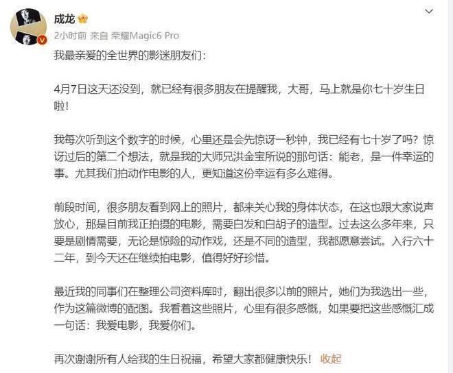 成龙本人倒看得开。他说那张“病容”其实是为新片留的白发造型,“大家别担心”。可我们该担心的,从来不是他会不会老、会不会病,而是为什么一个功勋卓著的艺术家,连活着都要反复自证?
