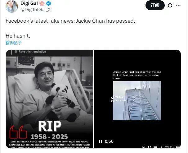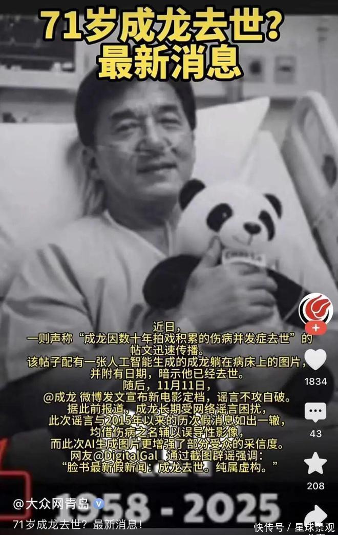 这已不是第一次。从2015年起,每隔一两年,成龙就得“死”一回。有时是“突发心梗”,有时是“癌症晚期”,这次升级了,用AI生成一张以假乱真的病床照,连皱纹走向都模仿得惟妙惟肖。技术越先进,造谣越高效;流量越饥渴,吃人越无声。