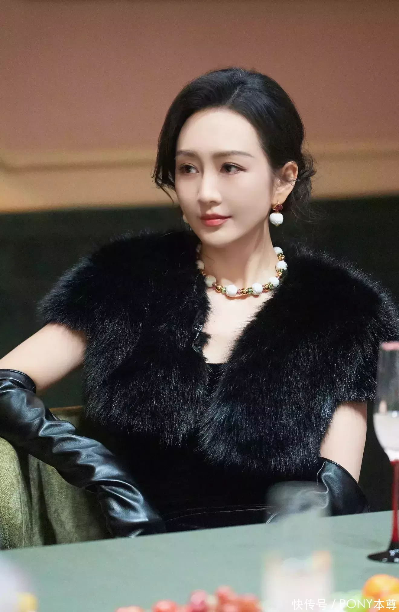 王鸥的气质轻熟,穿皮草更是自带贵气感!这次在综艺节目中,身穿一袭黑色短款毛皮草外套,内搭一件黑色丝绒开叉连衣裙,两种不同材质的黑色服饰混搭出高级感!